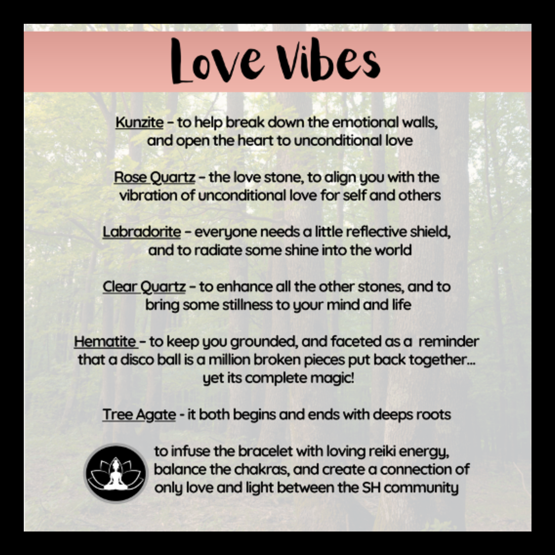 An intentional Reiki infused bracelet, set with the intention of loving vibrations. Wear on the left hand to bring in feelings of love, and on the right hand to release anything that takes you out of a state of feeling loved.